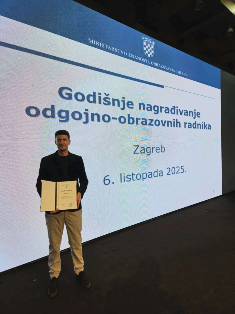 Ministarstvo znanosti, obrazovanja i mladih svake godine na Dan učitelja nagrađuje najuspješnije odgojno-obrazovne djelatnike u prethodnoj školskoj godini. Ove je godine jedan od nagrađenih naš nastavnik Hrvatskoga jezika Alen Orlić.